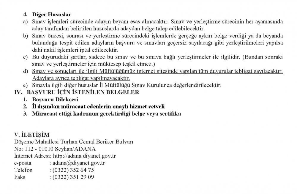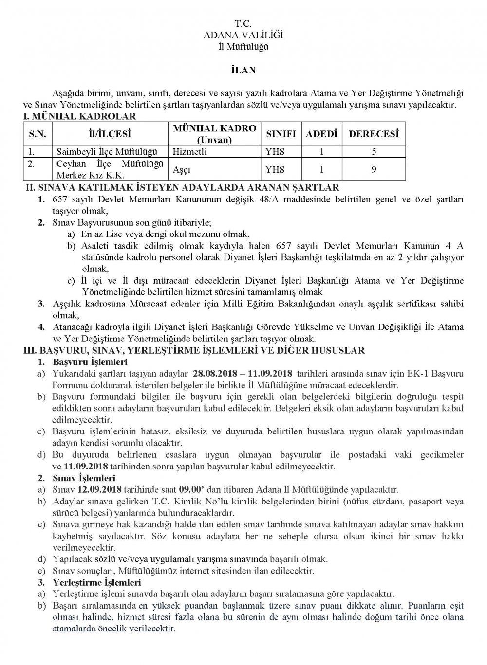Adana Müftülüğü Münhal Kadro İlanı – Eylül 2018