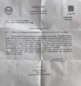 Karara ilişkin müfettiş raporu ve Atama Daire Başkanlığı’nın yazısında, Özdemir’in, “bir din görevlisi olarak toplumda örnek olma vasfına aykırı hareket ettiği, İslam Dinince yasaklanmış ve ahlaken çirkin olan, toplumda nefretle karşılanan” davranışlarda bulunduğunun anlaşıldığı kaydedildi.