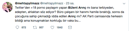“Twitter’dan +18 porno paylaşım yapan Bülent Arınç mı bana terbiyeden, edepten, ahlaktan söz ediyor? Büro çalışanı bir hanımı hamile bıraktığı, sonra da çocuğuna sahip çıkmadığı iddia edilen Arınç mı? AK Parti camiasında herkesin bildiği ama konuşmaktan korktuğu bir vaka bu…” Yılmaz’ın iddiası kısa sürede sosyal medyada gündem oldu.