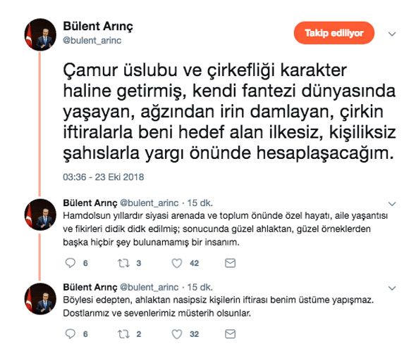 Arınç daha sonra da “Hamd olsun yıllardır siyasi arenada ve toplum önünde özel hayatı, aile yaşantısı ve fikirleri didik edilmiş; sonucunda güzel ahlaktan, güzel örneklerden başka hiçbir şey bulunamamış bir insanım. Böylesi edepten, ahlaktan nasipsiz kişilerin iftirası benim üstüme yapışmaz. Dostlarımız ve sevenlerimiz müsterih olsunlar” paylaşımı yaptı.