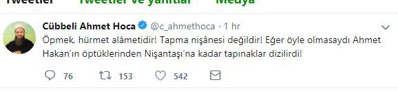 Sözleri ile Cübbeli Ahmet Hocan’ın Protezi öpmesini eleştirmişti. Bu eleştiriye Cübbeli’den manalı bir cevap geldi. Sosyal medya üzerinden verdiği cevapta “Öpmek, hürmet alâmetidir! Tapma nişânesi değildir! Eğer öyle olmasaydı Ahmet Hakan’ın öptüklerinden Nişantaşı’na kadar tapınaklar dizilirdi!” dedi.