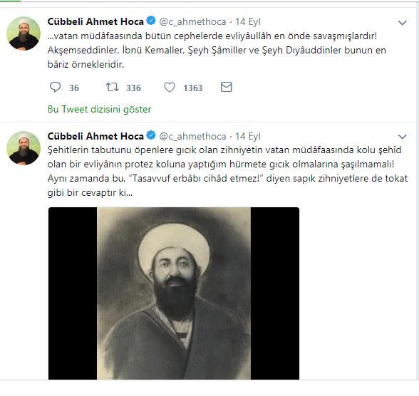 Cübbeli Ahmet’in 1. Dünya Savaşı sırasında kolunu kaybeden ve Sultan Mehmed Reşad tarafından kendisine protez kol yaptırılan Menzil şeyhi Diyaeddin’in protez kolunu öpmesi sosyal medyada çok konuşuldu.