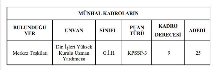 DUYURU Diyanet İşleri Başkanlığı merkez teşkilatında münhal bulunan; aşağıda unvanı, sınıfı, kadro derecesi, puan türü ve adedi belirtilen “Din İşleri Yüksek Kurulu Uzman Yardımcısı” kadrolarına atama yapmak için iki aşamalı (yazılı ve sözlü) yarışma sınavı yapılacaktır.