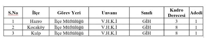 İlimiz genelinde münhal bulunan aşağıda unvanı, sınıfı, derece ve adedi belirtilen kadrolara Diyanet İşleri Başkanlığı Atama ve Yer Değiştirme Yönetmeliği ile Sınav Yönetmeliğinin ilgili maddeleri uyarınca sınavla naklen Veri Hazırlama ve Kontrol İşletmeni alınacaktır.