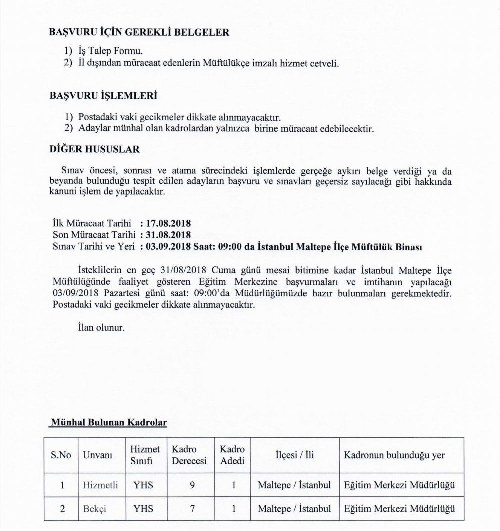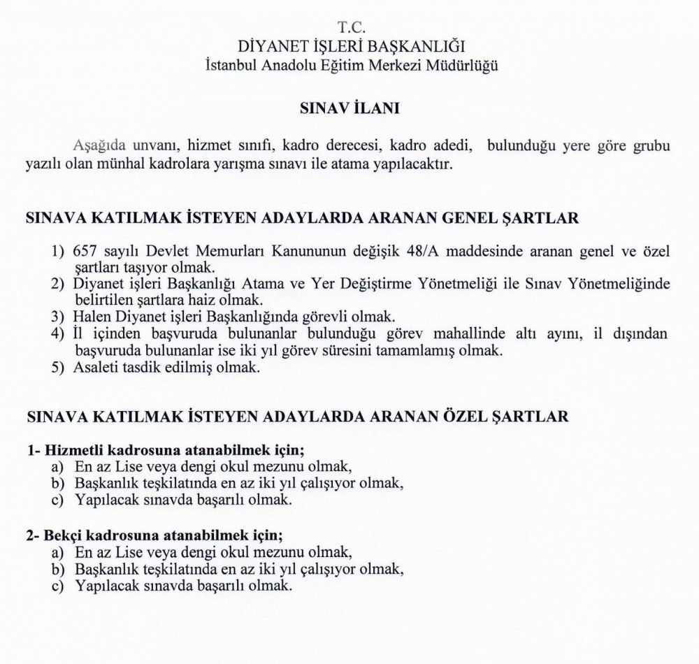 İstanbul Müftülüğü Genel İdare Hizmetleri ve Yardımcı Hizmetler Sınıfı Sınav İlanı