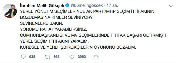 GÖKÇEK’TEN DİKKAT ÇEKEN TWEET.. Melih Gökçek dün aşağıdaki tweeti paylaşmıştı..