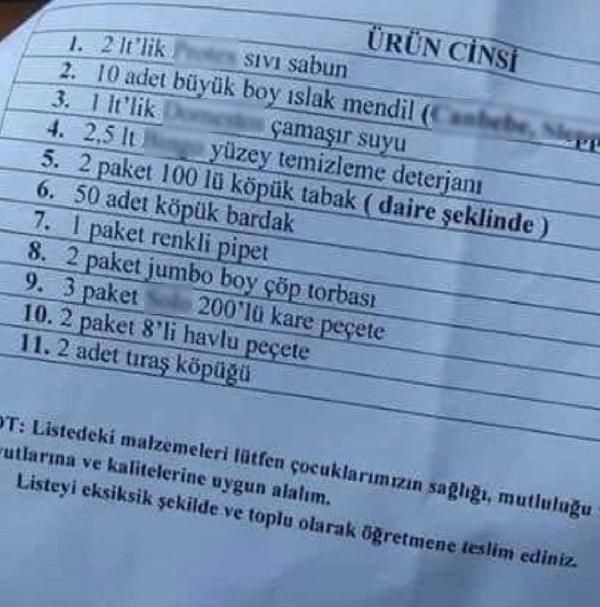 KKTC’de yeni öğretim yılı, okul yönetimlerinin öğrencilerden istekleri nedeniyle tartışmalarla başladı. Bazı okullardan öğrencilere verilen listelerde tuz ruhu, tuvalet kağıdı ve tıraş köpüğü gibi isteklerin yazılı olduğu görüldü. Ürünler için marka da belirtildiği görüldü.