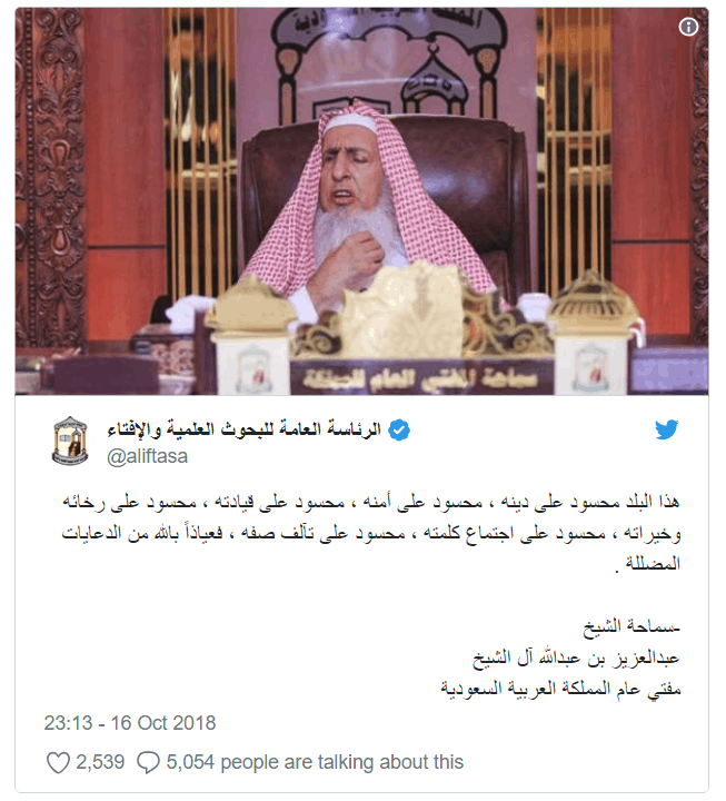 Cemal Kaşıkçı cinayeti sonrası zor bir süreçten geçen Suudi Arabistan’da uzun bir süredir sessiz olan müftü Abdülaziz âl-i Şeyh, açıklama yaptı.