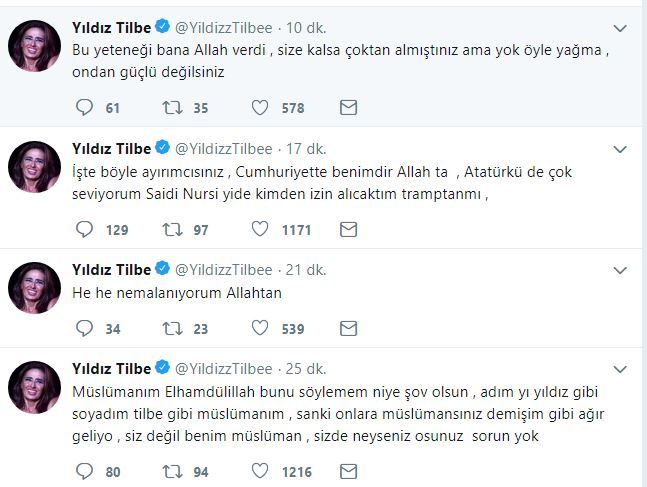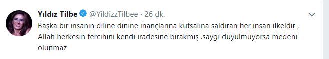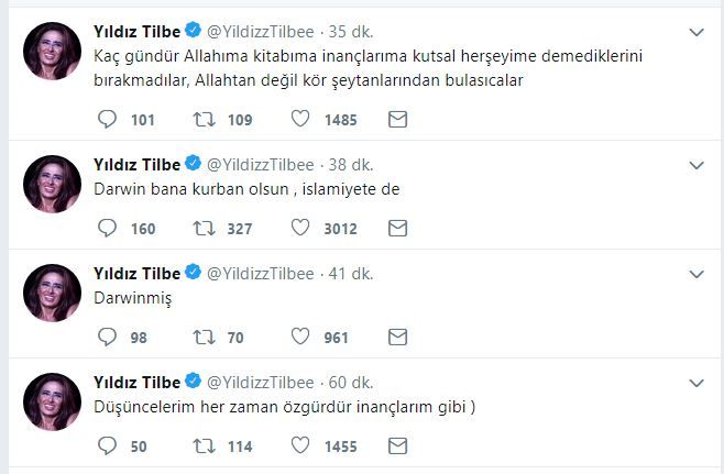 Son günlerin popüler twitter kullanıcısı Yıldız Tilbe sosyal medyayı kesip kavuracak yeni mesajlar paylaştı. Açıklamalarında darvinizim ve evrim konularına temas ederek evrimcilerin tüm dayanaklarını bir twitle alt üst eden Tilbe gelen tepkilere hiç aldırış etmeden düşüncelerinin arkasında durdu. Kendisine hakaret edenlere mealen sizin diniz size benim dinim bana deyip Adım Yıldız gibi, soyadım Tilbe gibi müslümanım dedi.